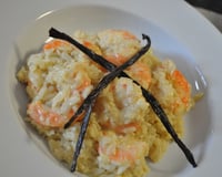 Faites un peu revenir les crevettes décortiquées avec les graines de vanilles et la gousse puis ajoutez la crème de coco et la crème fraîche. Quand la sauce est chaude ajoutez une pointe de couteau de curry salez et laissez mijoter à feu doux le temps que le riz cuise.