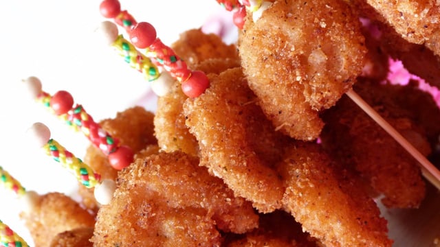 Plongez-les délicatement dans la friture et laissez cuire 1 min. Égouttez sur du papier absorbant et présentez sur des piques.