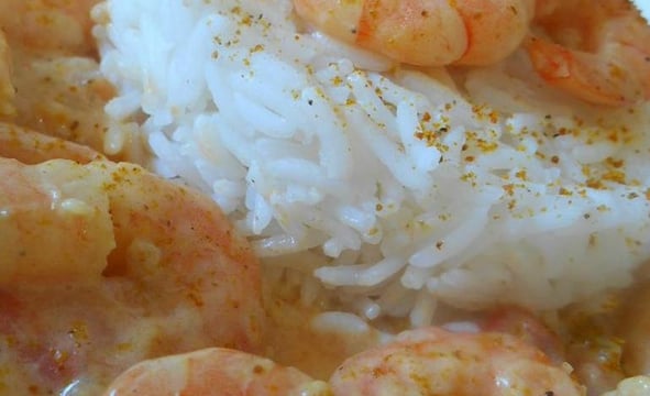 Verser le lait de coco, saupoudrer de curry et faire revenir 10 minutes. Ajouter les crevettes, la crème fraîche et laisser mijoter 5 minutes à feux doux.