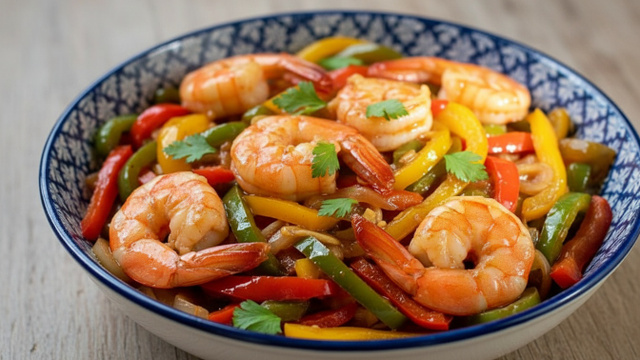Ajouter le saké ou vin blanc et laisser cuire encore quelques minutes avant d'ajouter les crevettes avec la sauce soja, la sauce huître, la sauce Tabasco®, le ketchup et le concentré de tomates. Mélanger et laisser cuire environ 3 mn jusqu'à ce que les crevettes deviennent roses. Servir bien chaud avec un riz blanc ou des nouilles chinoises.