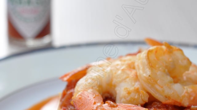 Faire revenir le tout sur feu vif, en remuant constamment, puis ajouter le fumet de poisson. Ajouter une vingtaine de gouttes de Tabasco. Baisser à feu moyen et laisser réduire le jus. Puis, filtrer et récupérer la sauce. Réserver au chaud.