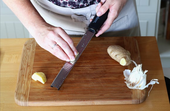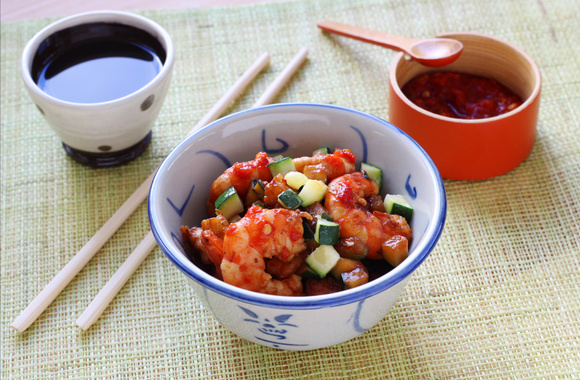 8Faites chauffer une cuillère à soupe d'huile dans un wok, ajoutez l'ail, le gingembre et faites-les revenir 30 secondes sur feu entre moyen et vif. Ajoutez les dés de courgettes et faites-les revenir sur feu moyen pendant 3 minutes. Versez dans un bol.