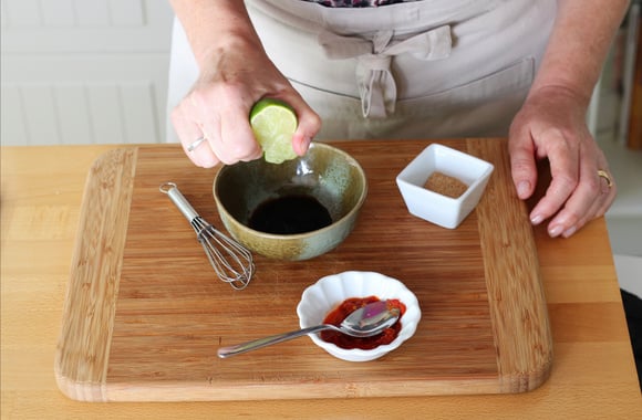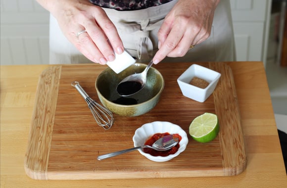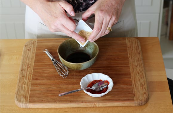 4Dans un bol, versez l'eau et ajoutez la sauce soja.