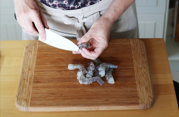 3Décongelez les crevettes puis décortiquez-les. Fendez-les sur le dos, afin de retirer le boyau central.