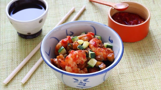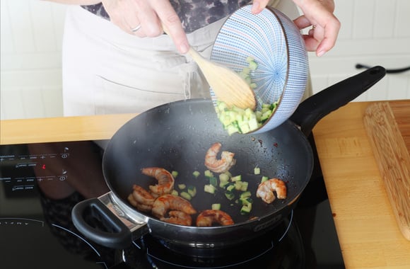 12Ajoutez les courgettes, mélangez et faites cuire encore 1 minute. Il ne doit presque plus rester de jus et les crevettes doivent tout juste cesser d'être translucides.