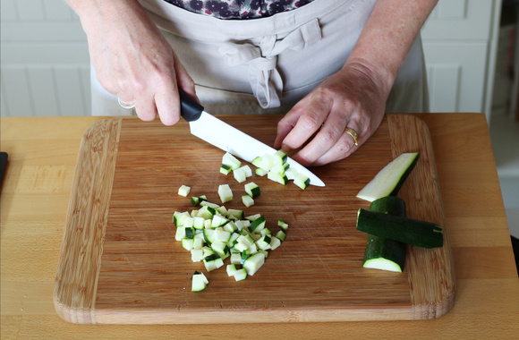 1Lavez la courgette, retirez les extrémités et coupez-la en petits dés.