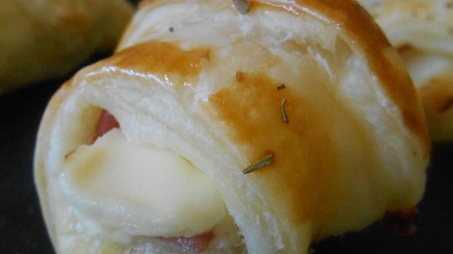 Découper la pâte feuilletée en 16 petits triangles et les fromages en 4 morceaux. Sur chaque triangle, disposer un morceau de jambon et de kiri.