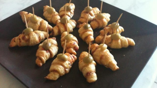 Poser sur une plaque et enfourner pour 15 minutes jusqu'à qu'ils soient bien dorés. Piquez une olive sur chaque croissants. Dégustez.