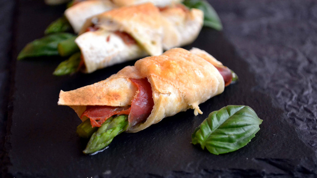 Disposez 1 tranche de jambon cru sur le pesto ainsi que 2 asperges par part. Ajoutez 1 feuille de basilic et roulez le tout pour former des petits croissants.