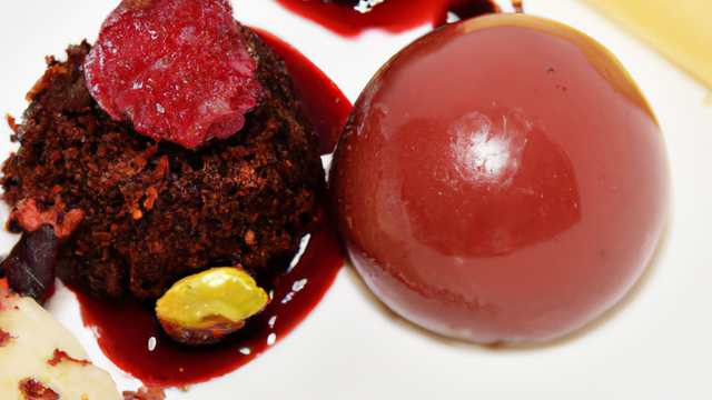 Confire 100 g de poivron rouge sans la peau dans l'huile d'olive.Réaliser un sirop avec 100 g de sucre et 50 g d'eau.Ajouter le sirop dans 500 g de framboises. Mixer avec le poivron confit.Turbiner ou pacosser. - 3Dressage :Caler les cromesquis avec un petit peu de crème pâtissière chocolat pour éviter qu'ils ne roulent dans l'assiette.Réaliser une quenelle de sorbet et la caler avec un peu de poudre de noisette.Décorer avec un trait de coulis de framboises.