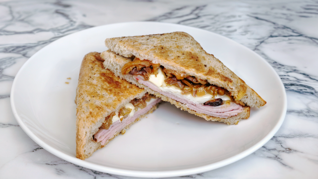 Ajouter sur une tranche un peu d'aubergines, recouvrir avec 2 tranches de mozzarella, une tranche de jambon et recouvrir avec du pain de mie.