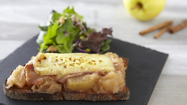 Etaler la Compotée de Pommes Cassegrain sur les tranches de pain grillé, puis ajouter une tranche de jambon de parme et enfin les tranches de fromage.