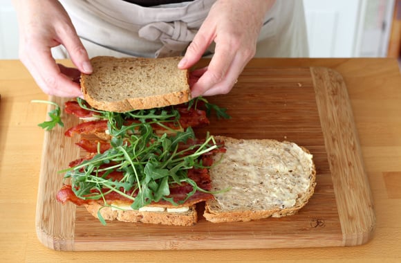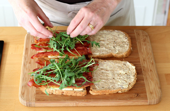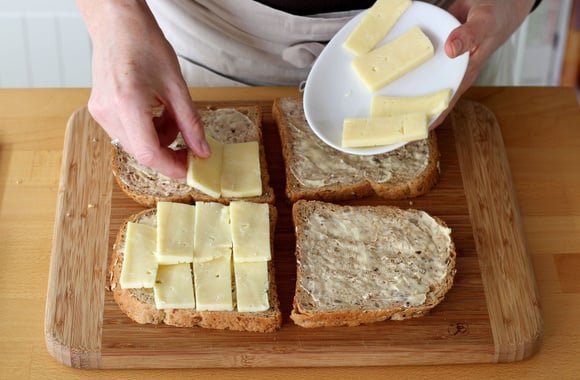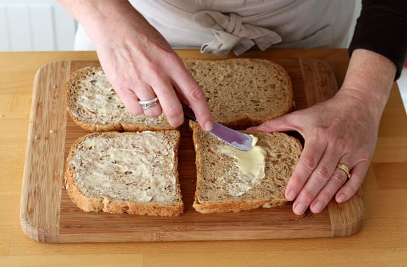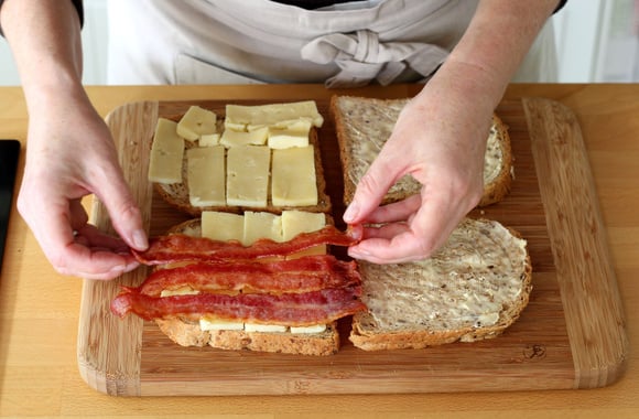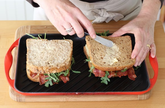 7Fermez les croque-bacon, en mettant la partie beurrée en dessous puis beurrez le dessus.