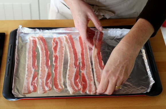 2Préchauffez votre four programme grill, étalez le bacon sur une plaque recouverte de papier cuisson ou de papier aluminium et enfournez pour 5 minutes. Le bacon doit être bien grillé et croustillant. Déposez-le sur du papier absorbant.
