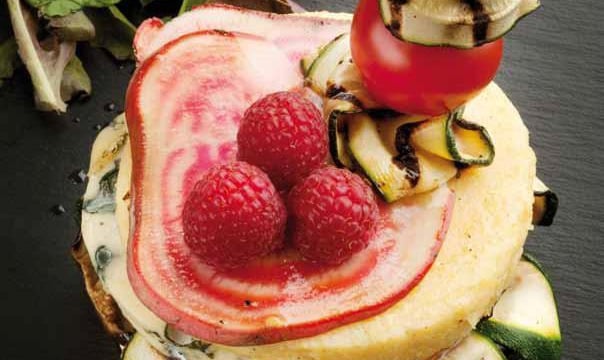 Déposer les tranches d'aubergines, courgettes, les tomates en dés et terminer par une tranche de Fourme d'Ambert sur la polenta.