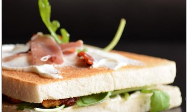 Prenez la deuxième tranche de pain de mie sur laquelle vous tartinerez à nouveau mais légèrement de St Morêt® et posez cette face tartinée sur la roquette. Posez à nouveau sur le dessus un peu de St Morêt®, un petit bout de jambon et quelques tomates séchées, une feuille de roquette et servez.