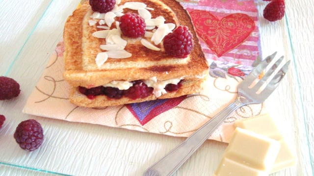 Un croque monsieur version sucrée associant l'acidité de la framboise et la douceur du chocolat blanc.