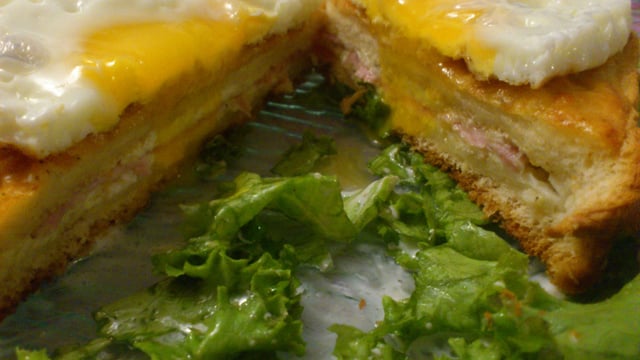 Pour un croque Madame, faire cuire un œuf au plat et le mettre sur le croque Monsieur. Servir avec une salade verte simple.