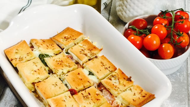 Recommencez jusqu’à atteindre le haut du plat en terminant par une couche de pain de mie que vous aurez préalablement badigeonner du mélange basilic/ail.