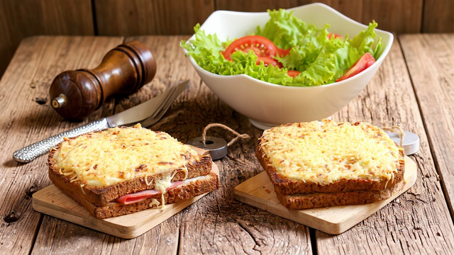 Un vrai classique des casse-croûtes français. Il existe des versions avec ou sans béchamel. Ici ce sera avec car elle apporte beaucoup de moelleux. Il se déguste généralement accompagné d’une salade verte.
