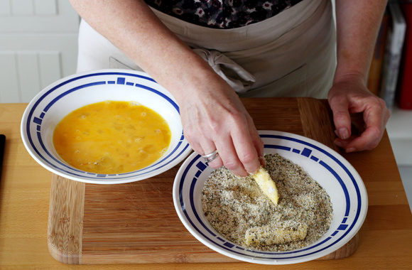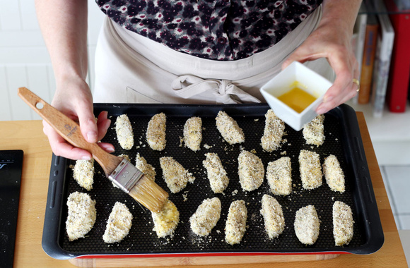 5Puis dans la chapelure et déposez-les sur une plaque de cuisson anti-adhésive.