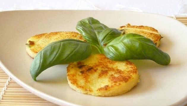 De la polenta sous forme de palet au bon goût de Cantal et basilic.