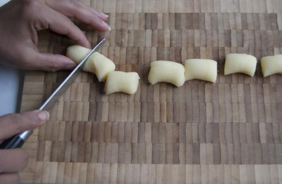 4Formez un cylindre sur une planche puis, à l'aide d'un couteau, coupez le cylindre de purée en petits tronçons.