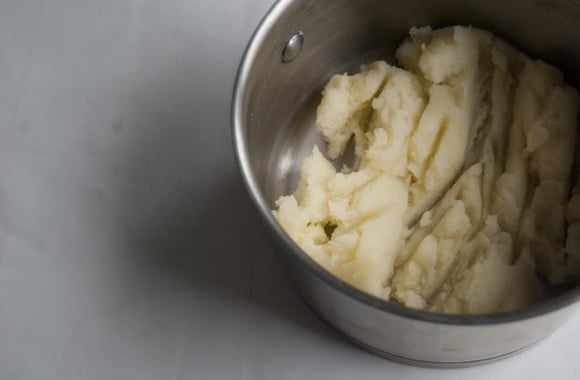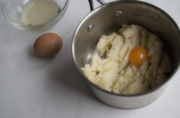 1Préparez une purée de pomme de terre, mettez-la dans une casserole sur un feu doux. Mélangez à l'aide d'une spatule en bois jusqu'à ce que l'eau s'évapore, afin que la purée soit bien sèche.
