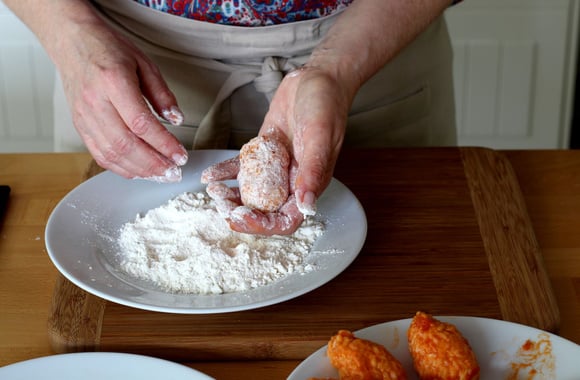 13Versez la farine dans une assiette plate, les deux oeufs dans une assiette creuse et battez-les puis la chapelure sur une assiette plate. Passez chaque suppli' dans la farine puis secouez pour retirer l'excédent.