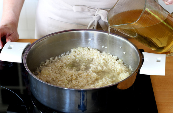 3Ajoutez le riz, mélangez et faites le revenir jusqu'à ce qu'il soit translucide. Si vous écoutez bien, le riz "chante" quand il est prêt à accueillir les liquides: il doit faire un bruit caractéristique (on dirait qu'il grince des dents). Ajoutez le vin blanc, mélangez et laissez-le s'absorber.