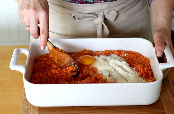 8Une fois que le riz a bien refroidi, ajoutez l'oeuf, le reste du parmesan et mélangez bien afin que l'ensemble soit bien amalgamé.