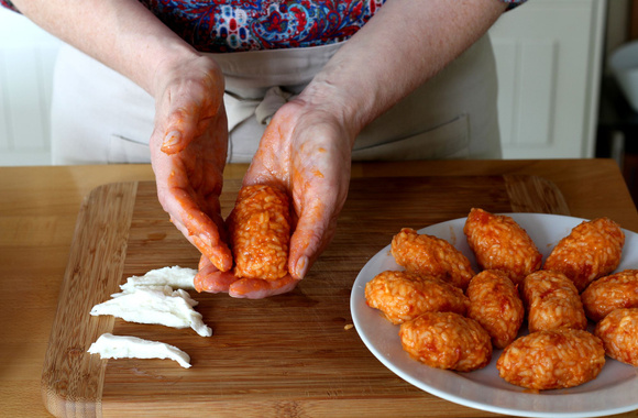 12Emballez bien hermétiquement le fromage et tassez la croquette entre vos mains. Faites de même avec le reste du riz et du fromage. Chaque croquette ne doit pas dépasser la paume de votre main. Ne les faites pas trop grosses, elles risquent de s'ouvrir pendant la cuisson. Mouillez de temps en temps vos mains afin que la farce ne colle pas de trop.