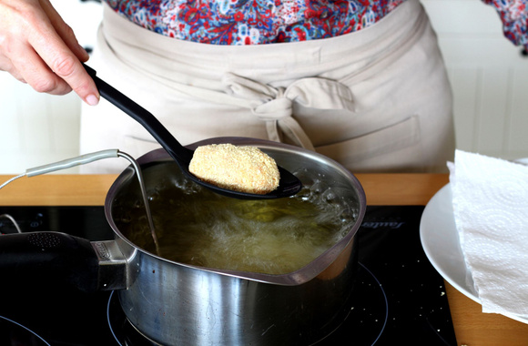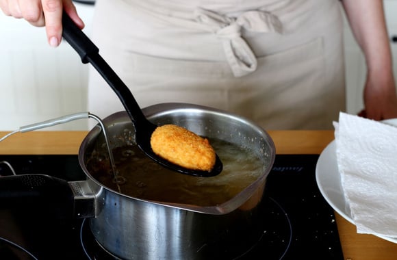 16Versez l'huile de friture dans une casserole et faites chauffer à 170°C. Plongez 3 suppli' et faites-les frire.