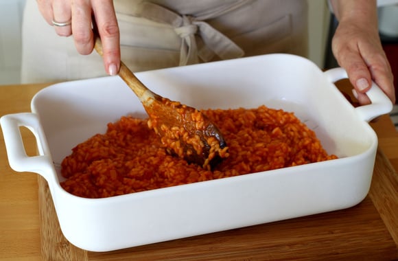 7Afin de faire refroidir plus rapidement le risotto, versez-le dans un plat à gratin que vous aurez mis préalablement au congélateur et lissez la surface. Laissez refroidir pendant une trentaine de minutes, voire plus...