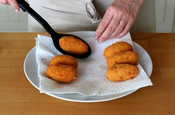 18Posez-les sur une assiette recouverte de papier absorbant. Faites frire le reste de la même manière, trois par trois. Essuyez au fur et à mesure les suppli' avec du papier aborbant afin de les garder bien croquants.
