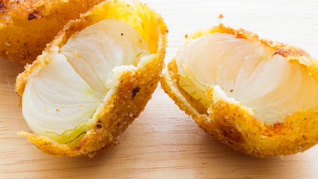 Faites chauffer l'huile de friture à 180°C. Passez les oignons dans la farine, les oeufs battus et la chapelure.