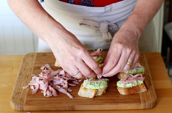 11Recouvrez la purée de courgettes avec des lanières de jambon.