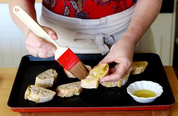 7Badigeonnez le pain avec de l'huile d'olive. Enfournez pour quelques minutes dans un four préchauffé à 200°C th.6/7). Le pain doit rester blond.
