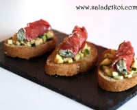 Disposer une cuillère de tartare de courgette sur chaque tartine grillée et surmonter le tout d'un petit rouleau de bresaola. Déguster bien frais !