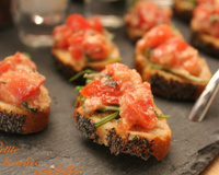 Sur chaque tranche déposez une feuille de roquette et une petite cuillère à café de tomates au pesto... il ne reste plus qu'à servir et déguster !