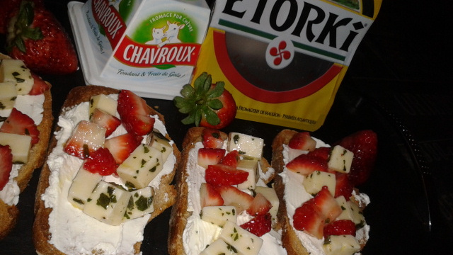 Déposer joliment la petite salade d'Etorki de fraise au basilic sur les tartine de Chavroux.