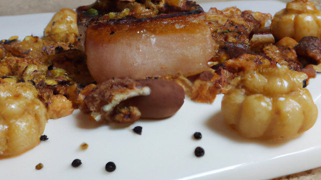 Emincer le choux finement et frire,assaisonner 5 épices,sel fin. Griller les rectangles de poitrine sous la salamandre aprés réchauffe au four dans le jus de cuisson.