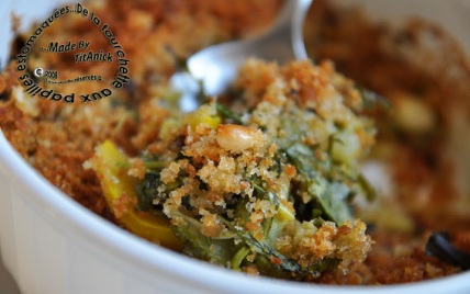 Préparez le crumble en mélangeant à la fourchette, le beurre bien ramolli, la chapelure et les pignons. Réservez.