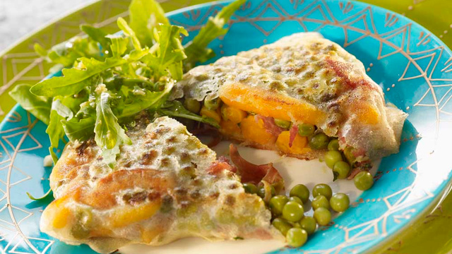 Déposer sur le dessus du croustillant un peu de petits pois carottes et le reste des lambeaux de jambon cru. Décorer de feuilles de coriandre et de graines de courge.