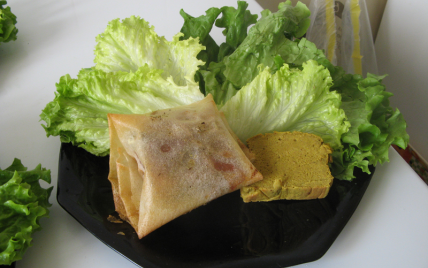 Servi avec une salade et un morceau de terrine de légumes, et d'une vinaigrette à l'huile de noix et vinaigre basalmique.