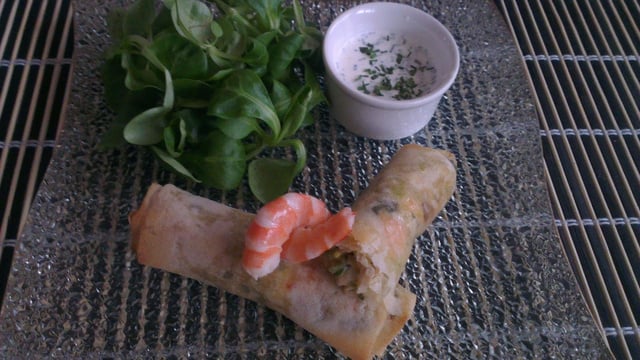 Rien de mieux qu'une fondue de poireaux à la créme avec des crevettes et du saumon fumé enroulés de feuille de brick croustillante, fondant et fraîcheur garantis.