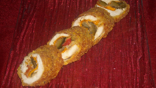 Enlevez le deuxième film, posez au bord de l'escalope 2 bandes de mimolette dans la longueur. Étalez 2 cuillères à s de ratatouille sur la mimolette et terminez par 2 autres bande de fromages.