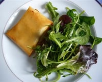 Feuilles de brick à la tartiflette (reblochon, jambon cru) accompagnés d'une salade verte.