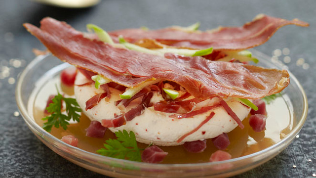 Coulez 7 à 8 cl de gelée de pomme dans des assiettes transparentes, ajoutez la brunoise de jambon et laissez prendre au frais. Ajoutez la chantilly de jambon, disposez par-dessus la julienne frite et quelques bâtonnets de pomme, Une tranche de jambon frite et quelques pluches d'herbes. - 5Dégustez !
