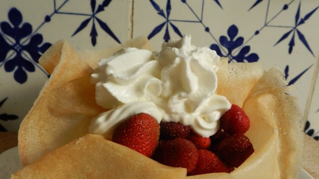 Juste avant de servir, garnir les croustillants de crème, puis de fraises lavées et équeutées puis encore de fraises.